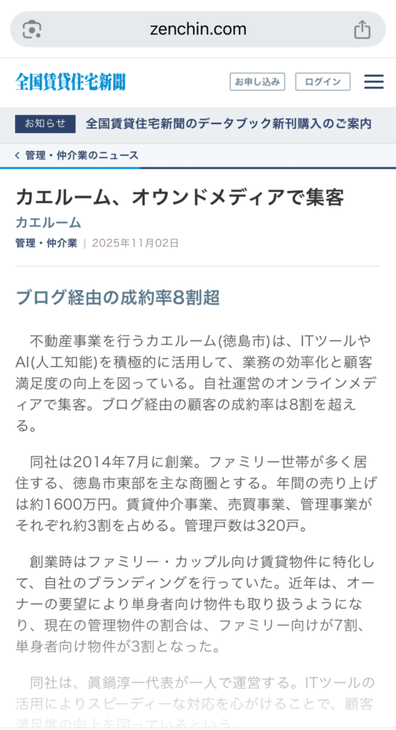 【WEBツールの活用など】全国賃貸住宅新聞で最新のAIツールやオウンドメディアでの取り組みが紹介されました。(2025.11月)